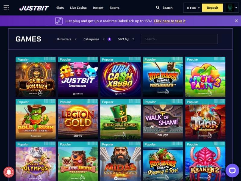 在 Justbit Crypto Casino 上玩遊戲,您可以玩傳奇的線上老虎機遊戲,例如 Gems Bonanza、Gaelic Golo、Big Bucks Bandits Megaways、Fire Strike 2、Legion Gold、Gates of Olympus、Book of Fallen、The Dog House Megaways 等等。