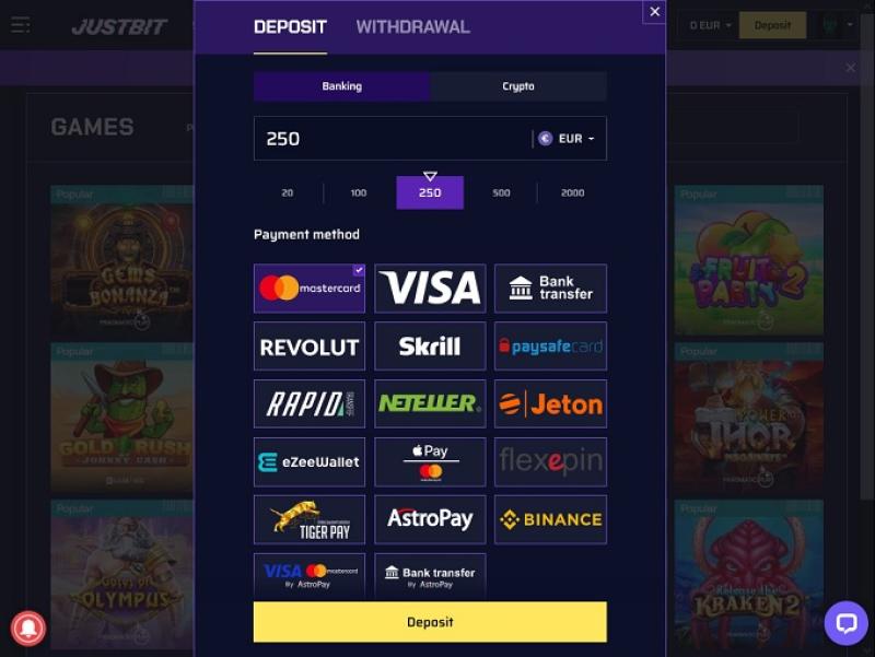 Banking銀⾏業務選項 的 Justbit Casino