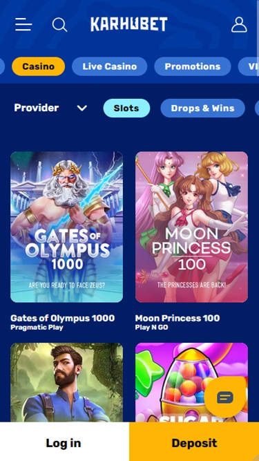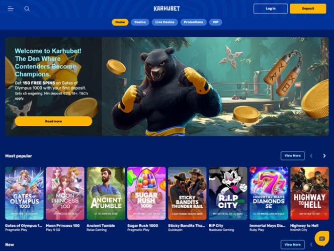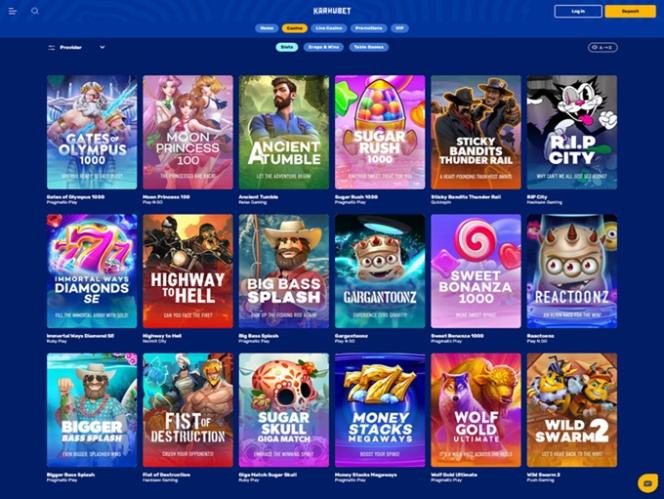 這個網站看起來很漂亮。它採用了賞心悅目的配色方案,以鮮豔的藍色和黃色為主色調,遊戲縮圖也製作精美。左側的主菜單可以幫助您輕鬆瀏覽各項功能,包括賭場、真人賭場、優惠活動和VIP專區。接下來,讓我們一起來看看KarhuBet為賭場會員提供的遊戲庫、其他功能和服務。