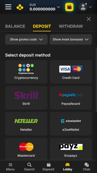這裡提供多種銀行服務。如果您喜歡傳統方式,可以使用Mastercard 、 Visa 、 Neteller 、 Paysafecard 、 Skrill 、 MiFinity 、 Revolut 、 Neosurf等。