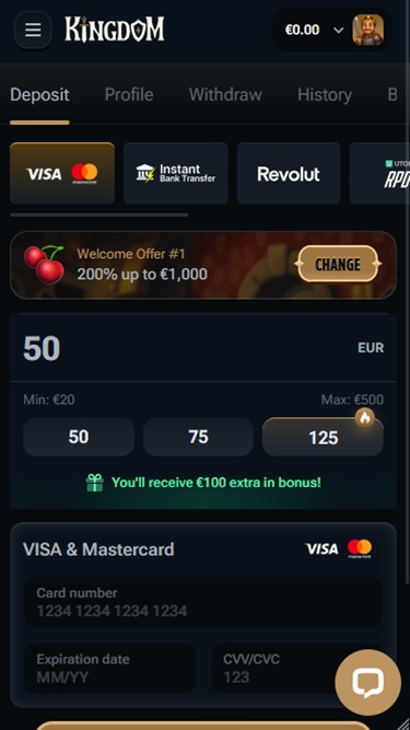 在促銷和獎金方面,Kingdom Casino 並沒有為玩家提供最全面的福利。不過,該品牌確實提供了豐厚的迎新獎金,旨在提升新玩家的初始體驗。