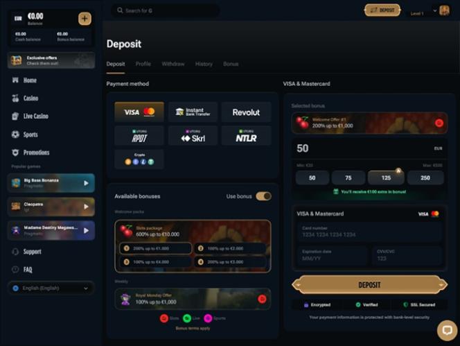 在這裡,玩家可以使用多種支付方式在其賭場帳戶中存取資金,包括Visa 、 Mastercard 、 American Express 、 AstroPay 、 Skrill 、 Neteller 、 Paysafecard和Revolut 。此外,玩家還可以使用多種加密貨幣來管理資金,可用的選項包括比特幣、比特幣現金、卡爾達諾、達世幣、狗狗幣、以太坊、萊特幣、 Solana 、波場幣、 USD Coin 、泰達幣、瑞波幣、 Zcash 。