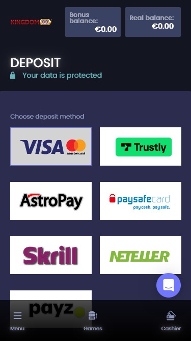 該賭場支援多種支付方式,包括支付卡、 Skrill 和 PayPal等熱門電子錢包、直接銀行轉帳以及加密貨幣銀行服務。請注意,KingdomACE 的提款速度可能會更快。