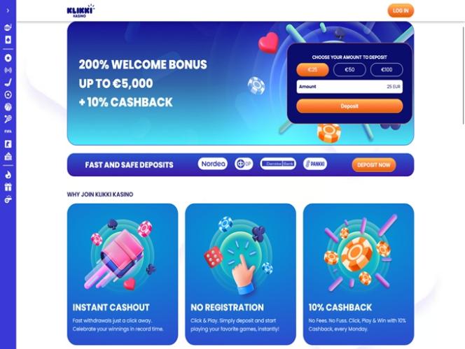 Klikki Kasino 是一個大型博彩網站,提供豐富的遊戲選擇,主要針對芬蘭玩家。該品牌提供數千款線上老虎機、真人荷官、桌上遊戲、速成遊戲以及眾多體育博彩選項,同時還提供豐富的促銷計劃,其中包含獨特的獎金、獎勵和回饋。