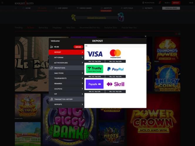 KnightSlots 賭場不支援加密貨幣交易,這對許多人來說可能有點令人失望,因為這類支付方式在過去幾年變得越來越普遍。即便如此,玩家仍然有許多非常受歡迎的銀行選項,例如 Visa、Mastercard、Astropay、Neteller、Skrill、Paypal 等等。