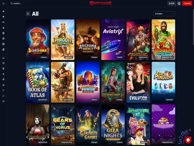 與 Kryptosino 合作的線上賭場軟體供應商名單令人印象深刻。其中不僅包括一些業內最大、最具影響力的巨頭,還有許多小型工作室,他們提供創新的賭場內容,這些內容開始改變 iGaming 格局,並樹立新的行業標準。尤其是在吸引人的加密遊戲方面,這一點尤其突出。