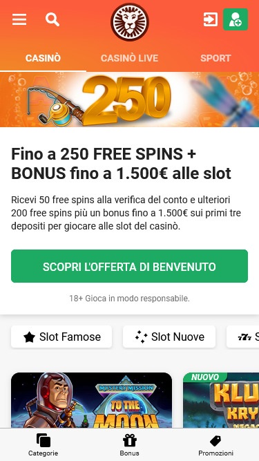 LeoVegas.it 是熱門線上賭場集團 LeoVegas 的意大利分公司,該集團服務於全球廣大地區。該網站與其姊妹網站類似,但專注於義大利博彩市場。我們非常喜歡 LeoVegas,以及他們在這裡提供優質線上遊戲的傳統,而且網站在行動裝置上的顯示效果也非常出色。