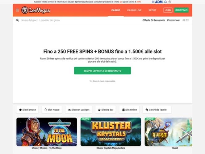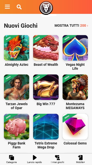 LeoVegas.it 賭場由 Microgaming, Net Entertainment, Playtech, 1x2gaming, Big Time Gaming, ELK Studios, Evolution Gaming, lightningboxgames, Novomatic, Play'n GO, Relax Gaming, Thunderkick, Pragmatic Play, Northern Lights Gaming, SpinPlay Games, Games Global, Blueprint Gaming, Greentube, NextGen, WMS, Red7Mobile, Side City Studios, Authentic Gaming, Iron Dog Studio, Foxium, Just For The Win, PearFiction Studios, Wild Streak Gaming, Alchemy Gaming, Rarestone Gaming, Snowborn Games, Area Vegas and Light & Wonder提供支持,其遊戲透過基於網頁的即時遊戲平台提供,可直接透過您的網路瀏覽器加載,無需下載繁瑣的軟體。該網站還支援行動端遊戲,您可以在智慧型手機或平板電腦上進行投注。