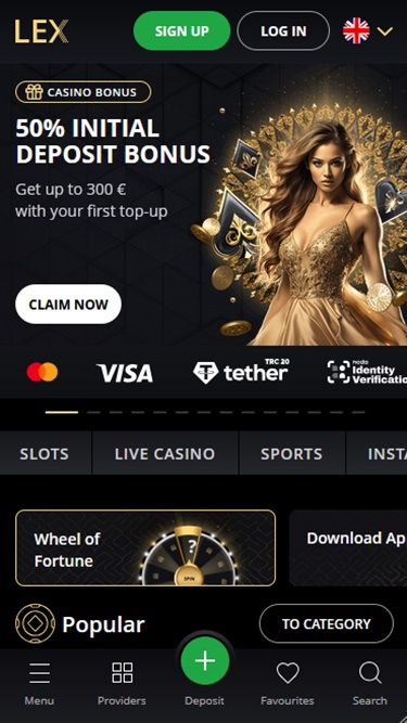 此外,LEX Casino 在網站頂部設有水平菜單,您可以快速存取主要的賭博選項、促銷活動、獎金和 VIP 俱樂部。該選單還允許您將網站語言切換為英語、俄語、德語、葡萄牙語、西班牙語和法語。