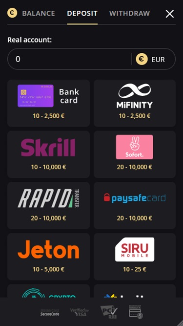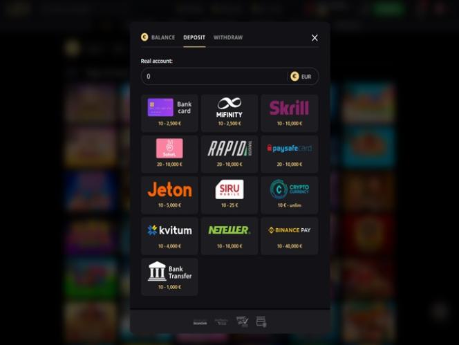 LEX Casino 讓使用者可以使用傳統和現代銀行方式進行存款和提款。傳統方式包括Visa 、 Mastercard 、 Apple Pay 、 Neteller 、 Skrill 、 Jeton 、 MiFinity等電子錢包和信用卡,以及銀行電匯。該網站也接受比特幣、比特幣現金、狗狗幣、以太坊、波場幣、瑞波幣、泰達幣和萊特幣等加密貨幣。