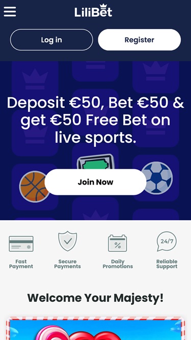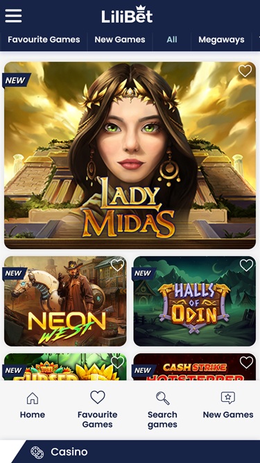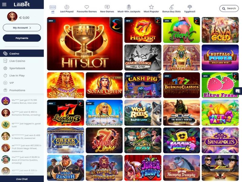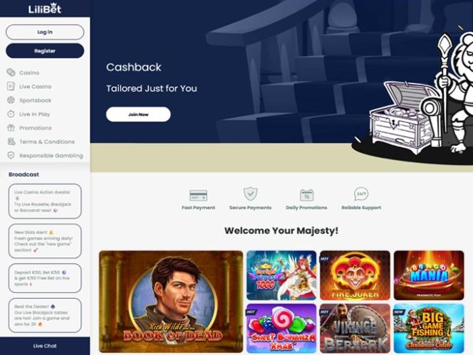 我們對 Lilibet 的第一印像是,這個品牌完全以玩家為中心。網站簡潔明了,瀏覽起來非常方便。賭場平台佈局合理,左側主菜單包含賭場、真人娛樂場和體育博彩等主要類別。此外,您還可以訪問“現場投注”,這是專門用於現場體育博彩的部分。此外,還有其他選項,例如:促銷活動、條款和條件以及負責任的博彩——所以,在 Lilibet 上,一切都非常簡單明了。
