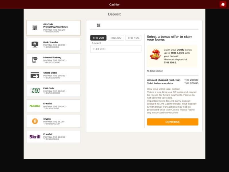 真人娛樂場的銀行系統採用即時銀行轉帳及直接銀行業務。娛樂場宣稱即時銀行轉帳的支付速度幾乎是即時的,但每週的支付限額為 5,000 美元。如果能提供更多選項就更好了,但考慮到亞洲在博彩交易方面的限制,我理解。