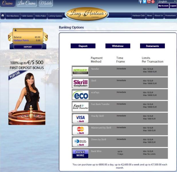 Long Harbour Casino 由 B3W提供支持,其賭場遊戲由瀏覽器內即時播放平台提供。Banking銀⾏業務選項 的 Long Harbour Casino