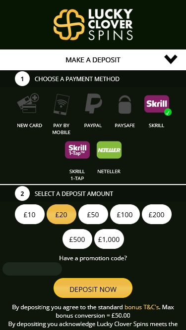說到銀行選項,您可以使用一些最受歡迎的銀行卡付款,例如 Visa、Maestro、MasterCard 和 Paysafe 卡。如果您願意,也可以透過 PayPal 付款。遺憾的是,Lucky Clover Spins Casino 不允許玩家透過加密貨幣存款,我們希望這種情況在未來能夠改變,因為越來越多的玩家希望透過加密貨幣進行賭場存款。