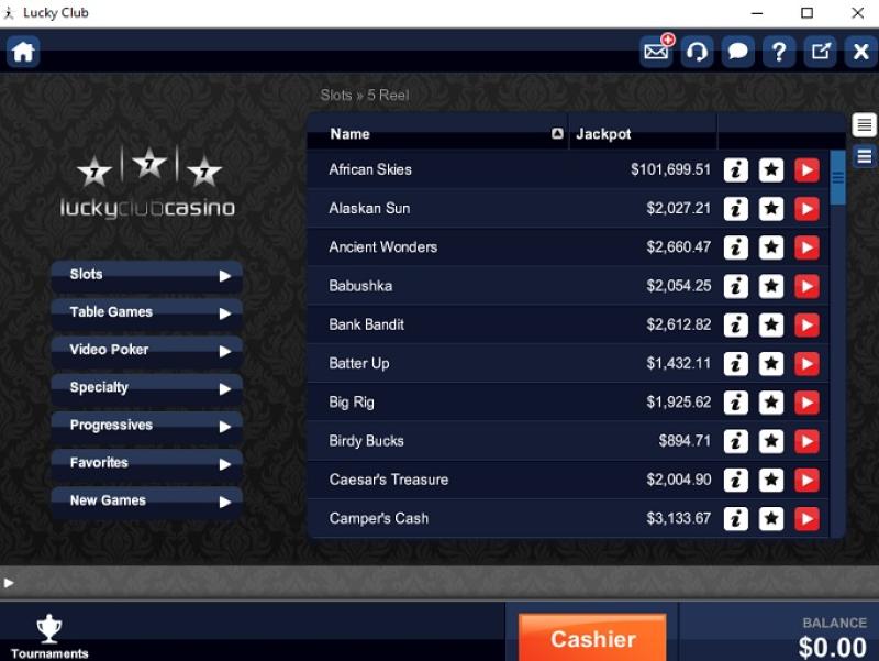 Lucky Club Casino 由 NuWorks提供支持,它透過基於網路且可下載的賭場用戶端提供數十種遊戲。其他遊戲