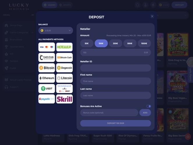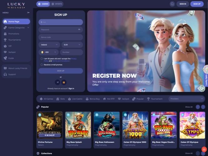 Lucky Friends Casino 是一個現代化的線上賭博網站,接受來自加拿大、紐西蘭、愛爾蘭和芬蘭的玩家。該品牌非常注重遊戲種類和體育博彩選項,讓玩家可以探索各種活動,包括真錢老虎機、真人荷官遊戲、桌上遊戲和即時崩潰遊戲。此外,賭場還提供全面的促銷計劃,包括許多獎金、福利和獎勵。