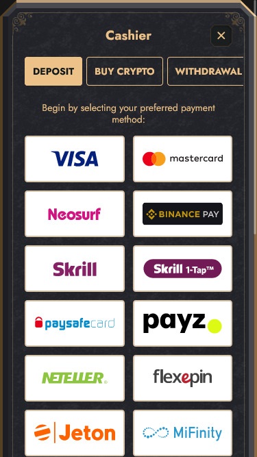 該賭場營運商為玩家提供豐富的傳統支付方式,例如Visa 、 Mastercard 、 Skrill 、 Neteller 、 AstroPay和Paysafecard 。此外,玩家還可以選擇使用比特幣、 萊特幣、 以太坊、 Tether 、 Tron 、 瑞波幣、 Solana 、 狗狗幣等加密貨幣。