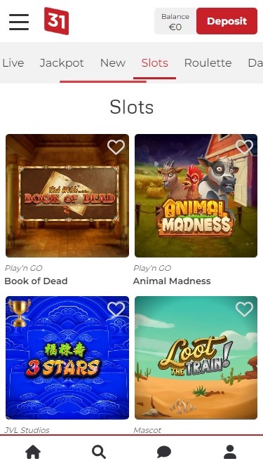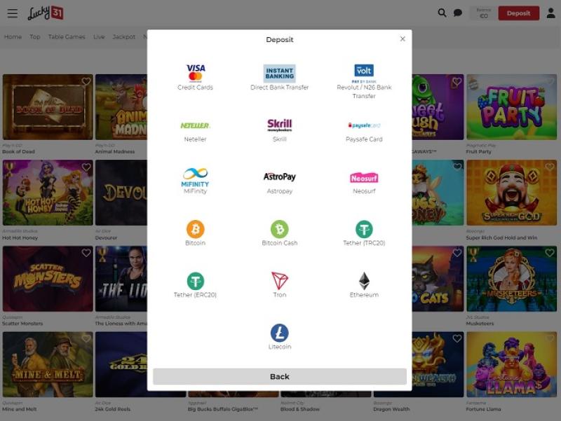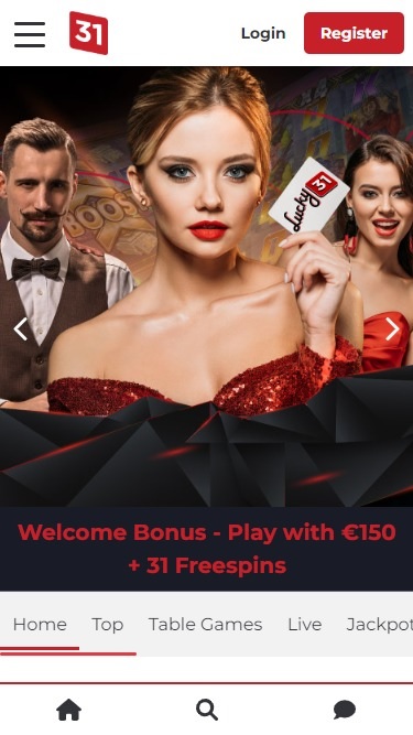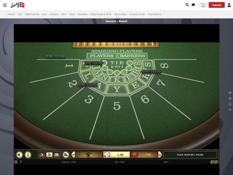 Lucky31 賭場由 Net Entertainment, BetSoft, Evolution Gaming, Habanero Systems, iSoftBet, Oryx, Play'n GO, playson, Quickspin, Relax Gaming, Saucify, Thunderkick, Visionary iGaming, WM, Yggdrasil, Wazdan, GameArt, Booming Games, Stakelogic, Pragmatic Play, Nolimit City, Felt Gaming, Red Tiger Gaming, Booongo, Air Dice, LuckyStreak, Spinomenal, Fantasma Games, SYNOT Games, Revolver Gaming, Spinmatic, BGAMING, Evoplay, Electric Elephant Games, Bulletproof Games, Gluck Games, Mascot Gaming, Spearhead Studios, Swintt, Mancala Gaming, SmartSoft Gaming, Blue Guru Games, Lady Luck Games, Amusnet Interactive, CT Interactive, EveryMatrix, Push Gaming, Genii, Gamomat, Authentic Gaming, 4ThePlayer, AvatarUX, Gamevy, ReelPlay, Japan Technicals Games, Boomerang Studios, Hacksaw Gaming, Max Win Gaming, Bang Bang Games, Slotmill, Peter And Sons, Armadillo Studios, FlipLuck and Indigo Magic提供支持,其賭場遊戲透過網頁平台提供,使用者可在網頁瀏覽器中暢玩。此外,該賭場還提供行動端網站,用戶可透過智慧型手機或平板電腦存取。Baccarat