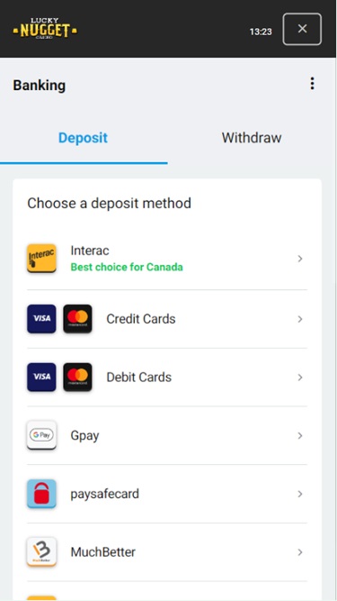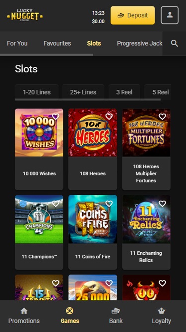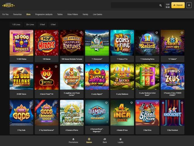 Lucky Nugget 賭場由 Microgaming, Net Entertainment, Evolution Gaming, Ezugi, Rabcat, Pragmatic Play, Red Tiger Gaming, Triple Edge Studios, Northern Lights Gaming, Stormcraft Studios, Switch Studios, Electric Elephant Games, All41 Studios, Gameburger Studios, Pulse 8 Studios, Neon Valley Studios, SpinPlay Games, Real Dealer Studios, GONG Gaming, On Air Entertainment, Buck Stakes Entertainment, Games Global, Old Skool Studios, Foxium, Just For The Win, PearFiction Studios, Wild Streak Gaming, Slingshot Studios, Fortune Factory Studios, Crazy Tooth Studio, Alchemy Gaming, Snowborn Games, Gold Coin Studios, Half Pixel Studios, Eurostar Studios, Aurum Signature Studios, Area Vegas, Wishbone Games, Circular Arrow, HammerTime Games, INO Games, Nailed It! Games, Neko Games and Oros Gaming提供支持,擁有數百款令人印象深刻的遊戲庫。賭場提供可下載的版本,以及即時遊戲的網頁版平台,方便您直接透過網頁瀏覽器進行遊戲。此外,也為希望在智慧型手機和平板電腦上玩遊戲的玩家提供行動網站。