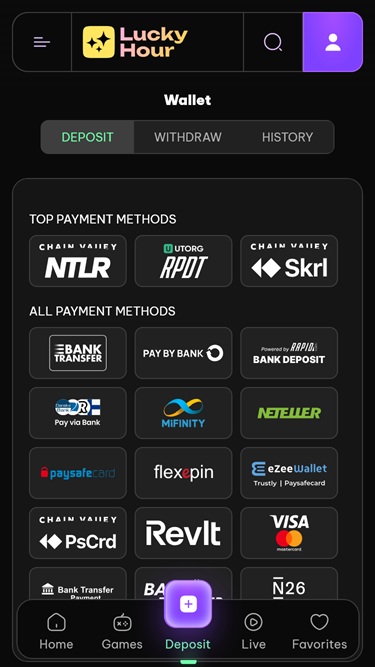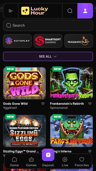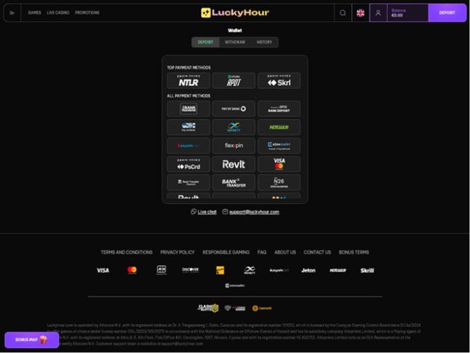 LuckyHour 賭場是一家根據庫拉索法律成立的線上賭場,由庫拉索博彩管理委員會 (Curacao Gaming Control Board) 頒發執照並監管。該賭場平台的主要客戶來自加拿大、紐西蘭、德國、奧地利和瑞士,但也歡迎其他司法管轄區的玩家加入。該網站提供希臘語、英語、法語和義大利語在地化版本,其井然有序的介面和友善的用戶體驗,讓我們一眼就被深深吸引。