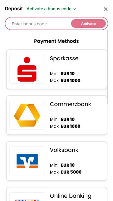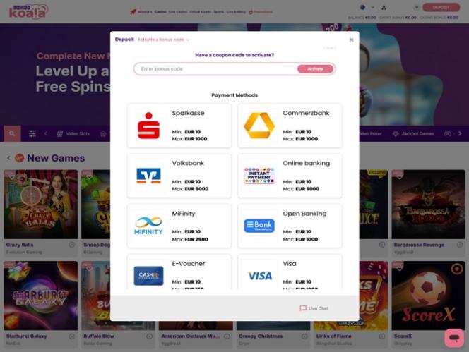 LuckyKoala 賭場為玩家提供多種存款和提款支付方式,包括眾多傳統和現代加密貨幣選項。傳統支付方式包括Visa 、 Mastercard 、 Neteller 、 Skrill 、 銀行電匯、 AstroPay 、 MiFinity 、 MuchBetter和Payz 。加密貨幣支付方式包括比特幣、 比特幣現金、 萊特幣、 USD Coin 、 Tether和瑞波幣。