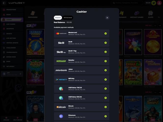 Lunubet Casino 提供豐富的傳統和加密貨幣支付方式,滿足全球玩家的需求,並提供多種可用貨幣。對於加密貨幣玩家,可選貨幣包括BTC、DOGE、ETH、LTC、SOL、TRX、USDC、USDT等。