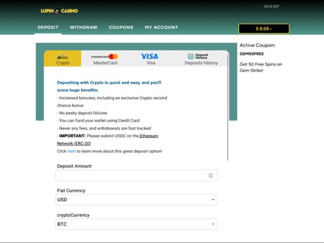 至於 Lupin's 提供的銀行選項,玩家可以選擇 BTC 付款和傳統支付方式,例如金融卡和信用卡、電子錢包、支票和直接電匯。