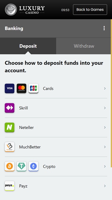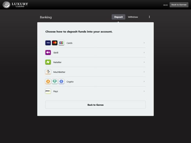 Luxury Casino的軟件供應商為 Microgaming, Evolution Gaming, Pragmatic Play, Triple Edge Studios, Northern Lights Gaming, Stormcraft Studios, Switch Studios, All41 Studios, Gameburger Studios, Pulse 8 Studios, Neon Valley Studios, SpinPlay Games, Real Dealer Studios, GONG Gaming, On Air Entertainment, Buck Stakes Entertainment, Games Global, Old Skool Studios, Foxium, Just For The Win, PearFiction Studios, Wild Streak Gaming, Slingshot Studios, Fortune Factory Studios, Crazy Tooth Studio, Alchemy Gaming, Snowborn Games, Gold Coin Studios, Half Pixel Studios, Eurostar Studios, Aurum Signature Studios, Area Vegas, Wishbone Games, Circular Arrow, HammerTime Games, Nailed It! Games, Neko Games, Reel Kingdom and Oros Gaming, 讓賭客有機會玩數百種遊戲。賭場提供玩家可以透過網站平台、 或是下載的⽅式將賭場遊戲裝置在玩家⾃⼰的電腦上玩遊戲。Baccarat