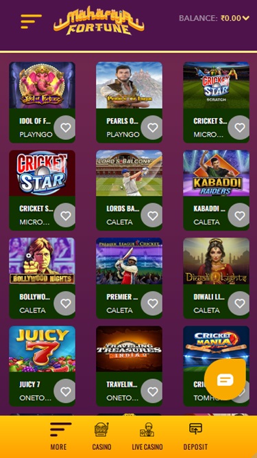 讓我們來看看印度遊戲部分的一些遊戲:Idol Of Fortune、Rich Wilde and the Pearls Of India、Cricket Star Scratch、Cricket Star、Lords Balcony、Kabaddi Raiders、Bollywood Nights、Premier League Cricket、Diwali Lights、Juicy 7、Traveling Tream、Andaved Roulette、Cricket War…