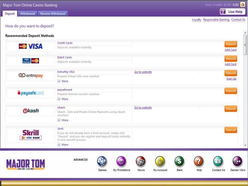 Major Tom 賭場由 Microgaming and Games Global提供支持,為玩家提供數百款遊戲以及一個易於瀏覽的卓越平台。 Major Tom 擁有一個基於網頁的平台以及一個可下載的客戶端軟體,可將所有遊戲直接放在您的電腦上。此外,它還擁有一個行動賭場網站,允許玩家透過智慧型手機或平板電腦進行遊戲。Baccarat