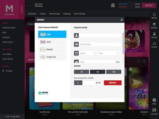 Matchbook Casino 由 Microgaming, Net Entertainment, 1x2gaming, Evolution Gaming, Nolimit City, Red Tiger Gaming, Triple Edge Studios, Stormcraft Studios, Switch Studios, All41 Studios, Neon Valley Studios, SpinPlay Games, Real Dealer Studios, Games Global, Iron Dog Studio, Just For The Win, PearFiction Studios, Slingshot Studios, Fortune Factory Studios, Alchemy Gaming, Gold Coin Studios, Aurum Signature Studios, Leap Gaming, Spribe and Nailed It! Games提供支持,其遊戲透過基於網頁的即時遊戲平台提供,讓您可以直接透過網頁瀏覽器註冊、存款和玩遊戲。該網站還內建了行動相容性,因此玩家可以透過智慧型手機和平板電腦輕鬆下注或玩遊戲。Baccarat