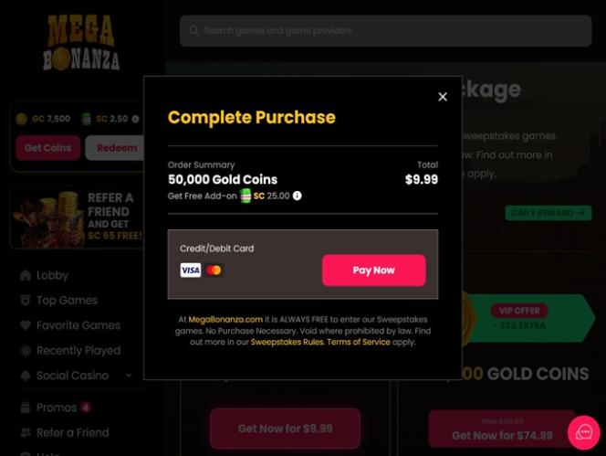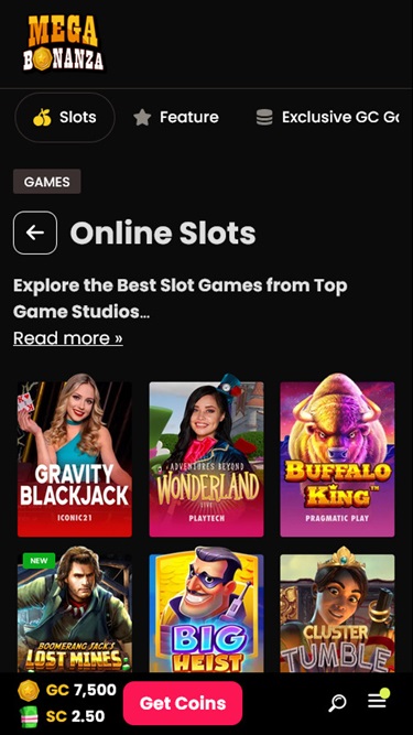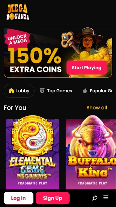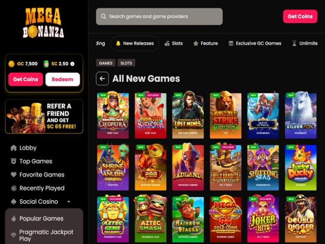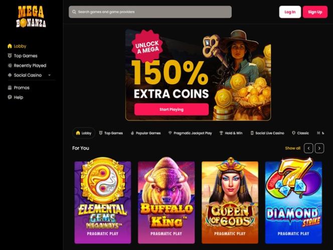 MegaBonanza 是一個有抽獎元素的社交遊戲網站,主要針對美國玩家(部分受美國限制的州),提供豐富多樣的賭場遊戲選擇,包括線上老虎機、真人荷官遊戲,甚至還有幾款 Slingo 遊戲。玩家可以享受各種促銷活動、獎金和累積獎金,還可以參加錦標賽贏取金幣和抽獎幣。