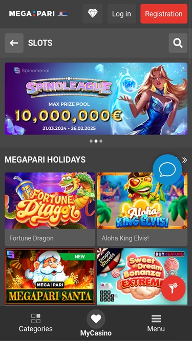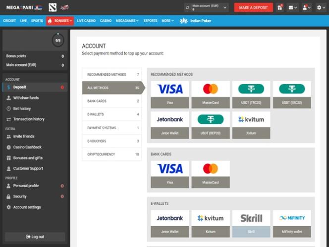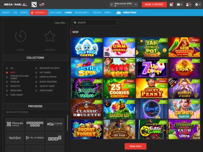 除了標準賭場外,Megapari 還為客戶提供完整的體育博彩、電子體育博彩、真人荷官賭場、撲克室和賓果遊戲室。