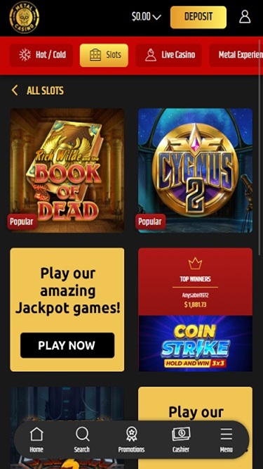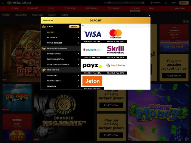 Metal Casino 由 Microgaming, Net Entertainment, Playtech, BetSoft, 1x2gaming, Barcrest, Big Time Gaming, ELK Studios, Evolution Gaming, EYECON, Ezugi, Habanero Systems, lightningboxgames, Novomatic, Oryx, Play'n GO, playson, Quickspin, Relax Gaming, Thunderkick, Yggdrasil, Wazdan, Realistic Games, Booming Games, Stakelogic, Pragmatic Play, Nolimit City, Red Tiger Gaming, IGT, Fantasma Games, Kalamba, Spin Games, Spadegaming, Triple Edge Studios, BGAMING, Northern Lights Gaming, Stormcraft Studios, Switch Studios, Electric Elephant Games, Pocket Games Soft, Bulletproof Games, All41 Studios, Gluck Games, Gameburger Studios, Pulse 8 Studios, Neon Valley Studios, Golden Rock Studios, Spearhead Studios, Shuffle Master, SpinPlay Games, GONG Gaming, Blue Guru Games, Lady Luck Games, Games Global, Amusnet Interactive, 2by2 Gaming, Ash Gaming, bluberi, EveryMatrix, Greentube, Merkur Gaming, NextGen, NYX Interactive, Push Gaming, Skill on Net, Inspired Gaming, Gaming Realms, Cayetano, SG Interactive, Gamomat, CORE Gaming, Scientific Games, Reel Time Gaming, Authentic Gaming, Bally Wulff, Iron Dog Studio, Old Skool Studios, Foxium, Betdigital, Zitro, Just For The Win, Reflex Gaming, Storm Gaming Technology, PearFiction Studios, Wild Streak Gaming, Slingshot Studios, Golden Hero, Fortune Factory Studios, Green Jade Games, STHLM Gaming, 4ThePlayer, AvatarUX, Gamevy, Crazy Tooth Studio, ReelPlay, Japan Technicals Games, Alchemy Gaming, Rarestone Gaming, BB Games, Black Pudding Games, Snowborn Games, Hacksaw Gaming, Max Win Gaming, Gold Coin Studios, Bang Bang Games, Copacabana Gaming, Ipanema Gaming, Half Pixel Studios, Peter And Sons, Eurostar Studios, Aurum Signature Studios, Armadillo Studios, Lucksome Gaming, Area Vegas, Wishbone Games, Apparat Gaming, Spribe, Circular Arrow, Print Studios, Gaming Corps, HammerTime Games, Four Leaf Gaming, INO Games, Nailed It! Games, Atomic Slot Lab, Neko Games, Reel Kingdom, Oros Gaming, Givme Games, JVL and Light & Wonder提供支持,其遊戲透過基於網頁的即時遊戲平台提供,可直接透過您的網頁瀏覽器載入。該賭場還全面支援行動端遊戲,您可以透過智慧型手機或平板電腦加載遊戲。