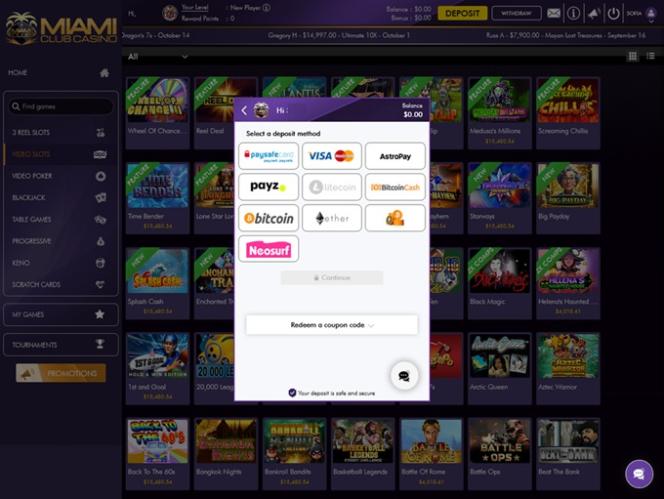 邁阿密俱樂部提供積分系統,可支付網站上所有真錢投注。玩家每在遊戲中累積1,000積分,即可兌換1.00美元真錢。賭場積分系統最低提現額度為2,000積分,而且積分累積可能需要很長時間,這意味著您可能需要玩一段時間才能兌換積分。所有積分必須至少投註一次才能兌換。
