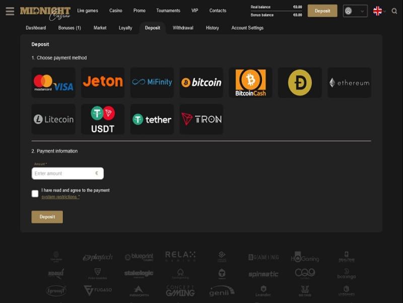 如前所述,Midnight Casino 是一家支援加密貨幣的線上賭場,玩家可以使用一些最受歡迎的加密貨幣進行存款和提款。此外,玩家還可以使用金融卡、信用卡以及一些知名的電子錢包。