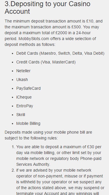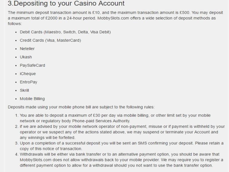 MobbySlots 賭場的銀行系統相當不錯,網站提供當日提款處理服務。網站支援使用銀行轉帳、EntroPay、Maestro、MasterCard、Skrill、Neteller、Paysafecard 和 Visa 進行存款和提款。值得慶幸的是,網站對獎金提款沒有限制。
