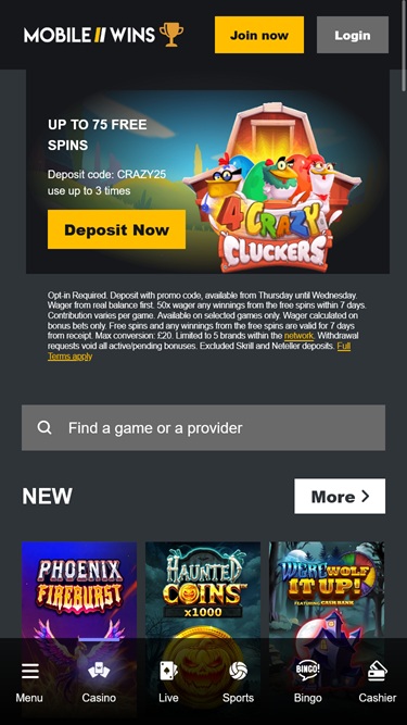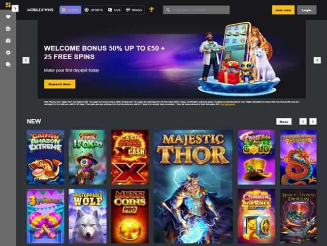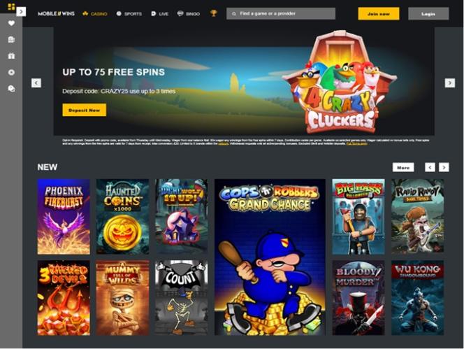 MobileWins 賭場由 Microgaming, Net Entertainment, Playtech, 1x2gaming, Barcrest, Big Time Gaming, ELK Studios, Evolution Gaming, EYECON, lightningboxgames, Play'n GO, Rabcat, Thunderkick, Wazdan, Pragmatic Play, Nolimit City, Red Tiger Gaming, Spinomenal, Skillzzgaming, Fugaso, SYNOT Games, Skywind, Triple Edge Studios, Northern Lights Gaming, Stormcraft Studios, Switch Studios, All41 Studios, Gluck Games, Gameburger Studios, Pulse 8 Studios, Slot Factory, Neon Valley Studios, Shuffle Master, SpinPlay Games, Real Dealer Studios, GONG Gaming, Buck Stakes Entertainment, Games Global, 2by2 Gaming, Blueprint Gaming, NextGen, Tom Horn Gaming, WMS, Inspired Gaming, SG Interactive, Red7Mobile, CORE Gaming, Scientific Games, Reel Time Gaming, Iron Dog Studio, Old Skool Studios, Foxium, Betdigital, Just For The Win, PearFiction Studios, Wild Streak Gaming, Slingshot Studios, Fortune Factory Studios, Gamevy, Crazy Tooth Studio, ReelPlay, Alchemy Gaming, Black Pudding Games, Snowborn Games, Hacksaw Gaming, Gold Coin Studios, Half Pixel Studios, Eurostar Studios, Aurum Signature Studios, Lucksome Gaming, Leap Gaming, Wishbone Games, Circular Arrow and HammerTime Games提供支持,其遊戲透過基於網頁的即時遊戲平台提供。該賭場還為使用智慧型手機或平板電腦的玩家提供行動網站。Baccarat