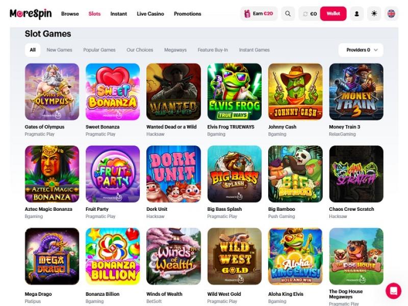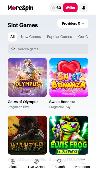 老虎機愛好者將在 MoreSpin 賭場玩得非常開心,因為這裡有無數優質的線上老虎機遊戲可供探索,例如 Wanted Dead or a Wild、Gates of Olympus、Sweet Bonanza、Xpander、Big Bass Splash、Cleocatra、Tropical Tiki、Mental等等。