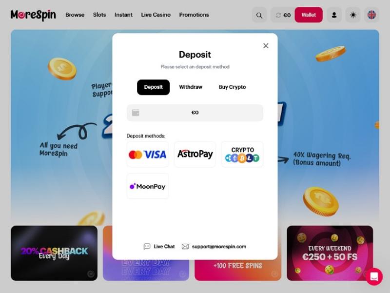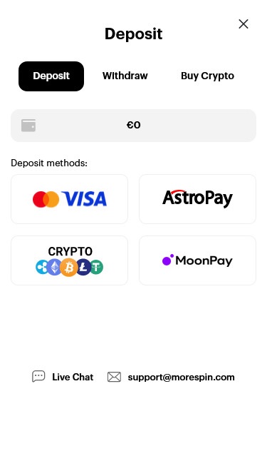 在 MoreSpin 賭場,您可以選擇 Visa、MasterCard、AstroPay 和其他電子錢包等熱門銀行服務。運營商還允許玩家使用加密貨幣進行存款和提款。