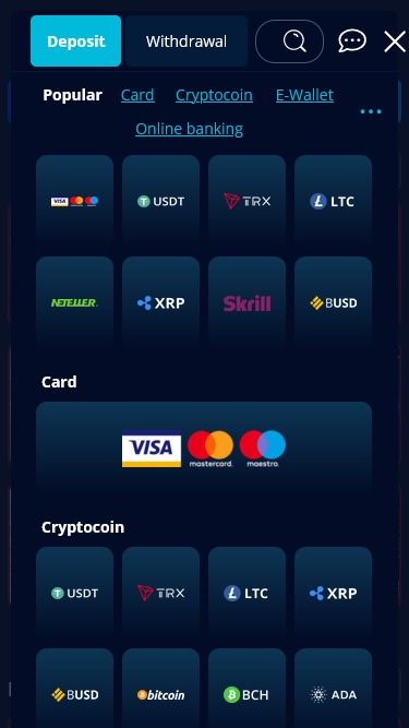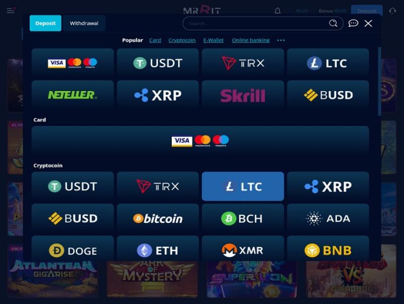 下面您將看到 Mr Bit 的不同銀行業務選項,包括存款和提款選擇。