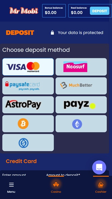 Mr Mobi 的銀行系統相當可靠,提供 Visa、MasterCard、Neteller、Paysafecard、Skrill、Sofort、Speedcard、Ticket Premium、Click and Buy、Maestro、EntroPay 和 ecoPayz 等多種銀行服務。賭場通常會在幾天內支付獎金,因此是一個值得信賴的博彩場所。