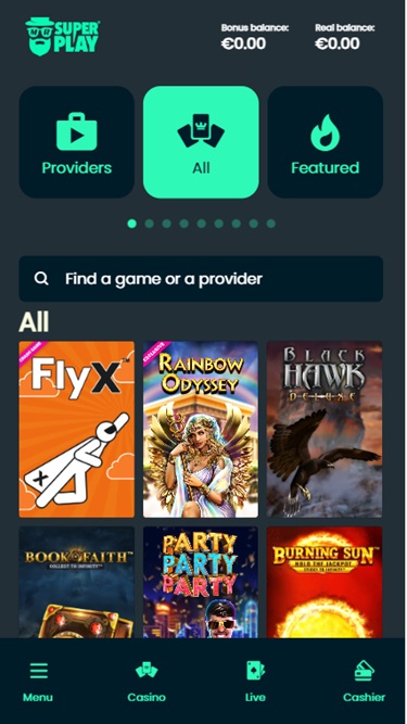 Mr SuperPlay 賭場由 Microgaming, Net Entertainment, Playtech, 1x2gaming, Barcrest, Big Time Gaming, ELK Studios, Evolution Gaming, EYECON, lightningboxgames, Novomatic, Play'n GO, Quickspin, Rabcat, Thunderkick, Wazdan, Pragmatic Play, Nolimit City, Red Tiger Gaming, Skillzzgaming, Fugaso, SYNOT Games, Skywind, Triple Edge Studios, Northern Lights Gaming, Stormcraft Studios, Switch Studios, All41 Studios, Gluck Games, Gameburger Studios, Pulse 8 Studios, Slot Factory, Neon Valley Studios, Shuffle Master, SpinPlay Games, Real Dealer Studios, GONG Gaming, On Air Entertainment, Buck Stakes Entertainment, Games Global, 2by2 Gaming, Ash Gaming, Blueprint Gaming, Greentube, NextGen, ProgressPlay, Tom Horn Gaming, WMS, Inspired Gaming, SG Interactive, CORE Gaming, Scientific Games, Reel Time Gaming, BF Games, Iron Dog Studio, Old Skool Studios, Foxium, Betdigital, Just For The Win, PearFiction Studios, Wild Streak Gaming, Slingshot Studios, Fortune Factory Studios, Gamevy, Crazy Tooth Studio, Groove Gaming, ReelPlay, Alchemy Gaming, Rarestone Gaming, Snowborn Games, Hacksaw Gaming, Max Win Gaming, Gold Coin Studios, Half Pixel Studios, Aurum Signature Studios, Lucksome Gaming, Area Vegas, Leap Gaming, Wishbone Games, Circular Arrow, HammerTime Games, INO Games, Nailed It! Games, Neko Games, Reel Kingdom, Oros Gaming and Light & Wonder提供支持,賭場遊戲透過基於網頁的即時遊戲平台提供,可直接透過您的網路瀏覽器載入。賭場還支援行動端遊戲,這意味著您可以在智慧型手機或平板電腦上玩遊戲。