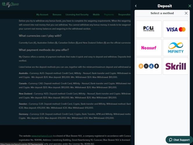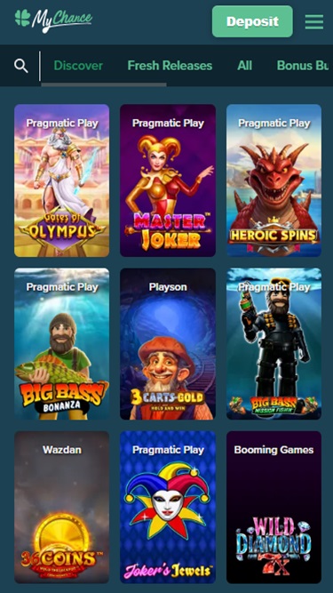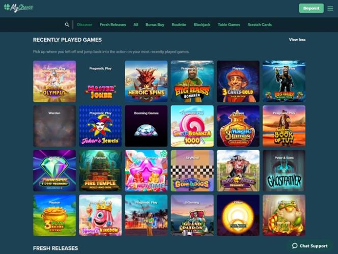 MyChance Casino 由 Microgaming, Net Entertainment, BetSoft, Evolution Gaming, Novomatic, Oryx, Play'n GO, playson, Rabcat, Thunderkick, Wazdan, Booming Games, Pragmatic Play, Nolimit City, Red Tiger Gaming, Booongo, Belatra Games, Kalamba, Revolver Gaming, Skywind, BGAMING, Evoplay, OneTouch, Pocket Games Soft, All41 Studios, Mascot Gaming, NetGame Entertainment, Pulse 8 Studios, KA Gaming, Games Global, Reevo, Greentube, Push Gaming, PlatinGaming, Foxium, PearFiction Studios, Wild Streak Gaming, Golden Hero, RubyPlay, AvatarUX, Japan Technicals Games, Alchemy Gaming, Snowborn Games, Hacksaw Gaming, Gold Coin Studios, Gamzix, Peter And Sons, Aurum Signature Studios, Gamebeat, ELA Games, 3 Oaks Gaming, Amigo Gaming and Reel Kingdom提供支持,該網站透過基於網頁的即時遊戲平台訪問,可直接透過您的電腦瀏覽器啟動。該網站還支援行動端遊戲,讓您在智慧型手機或平板電腦上投注。