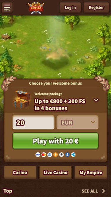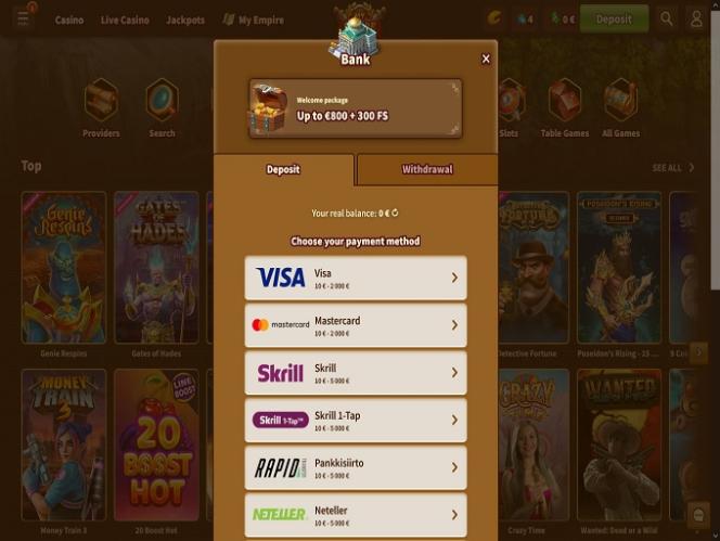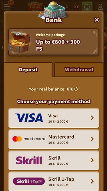 MyEmpire 的收銀員支援多種支付方式,以滿足玩家的需求。您可以選擇Neteller 和 Skrill等常用的電子錢包、支付卡、加密貨幣銀行選項以及其他線上支付系統: