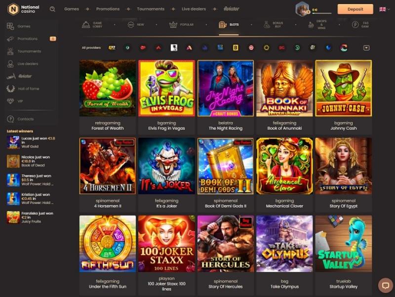 Endorphina、Belatra、 Evoplay Entertainment 、Push Gaming、EGT、ELK Studios、Realistic、Tom Horn Gaming、Yggdrasil 是與 National Casino 合作的眾多公司中的一部分。
