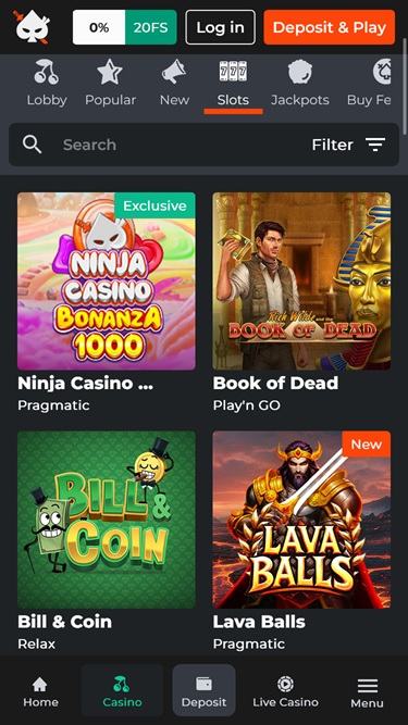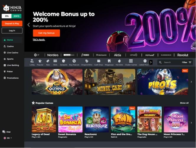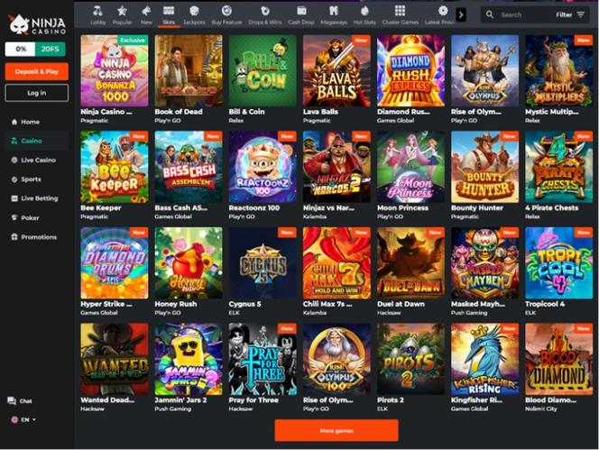 Ninja Casino 與 NetEnt、 Play'n GO 、Microgaming、Yggdrasil 等知名遊戲供應商合作,提供各種遊戲。除了老虎機和累積獎金,玩家還可以找到各種桌上遊戲和紙牌遊戲(輪盤賭、百家樂、二十一點、擲骰子、撲克),以及真人荷官遊戲。此外,也為體育及現場投注愛好者設有專屬專區,涵蓋足球、乒乓球、排球等眾多運動項目。Baccarat