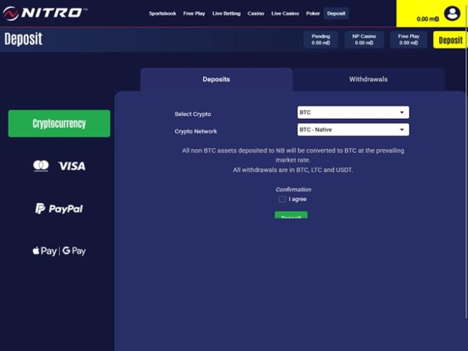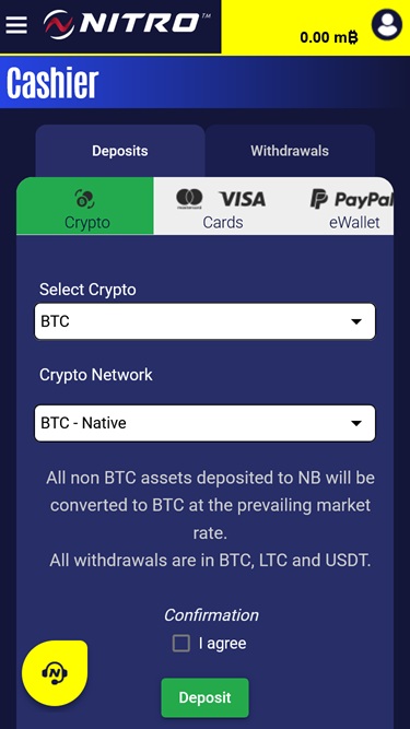 Nitrobetting Casino 支援多種加密貨幣,包括以太坊、泰達幣、USDC、萊特幣、比特幣、幣安和比特幣現金,但您的帳戶將顯示毫比特幣 (mBTC)。請注意,您可以透過加密貨幣支付選項、信用卡和金融卡、電子錢包和其他線上支付系統進行存款。加密貨幣支付方式僅用於提款。