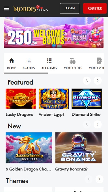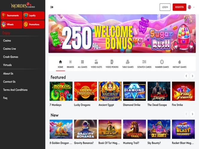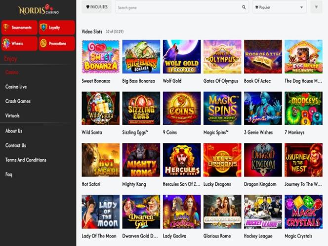 Nordis 提供的遊戲分為多個類別,方便使用者輕鬆瀏覽。賭場板塊包括:熱門老虎機、新遊戲、累積獎金老虎機、桌上遊戲、視訊老虎機、視訊撲克、刮刮卡、虛擬遊戲和視訊賓果遊戲。此外,也提供真人荷官遊戲。