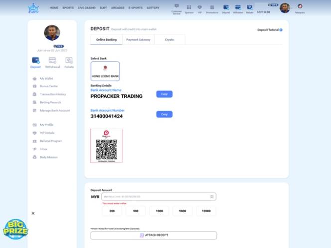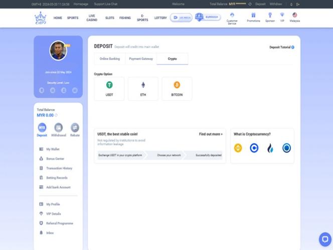 該平台在主頁頂部設有水平選單,方便存取所有遊戲類別和賭場頁面。在這裡,您可以快速導航到體育博彩、真人娛樂場遊戲、老虎機、彩票、遊戲廳、促銷活動、VIP計劃和客戶服務。